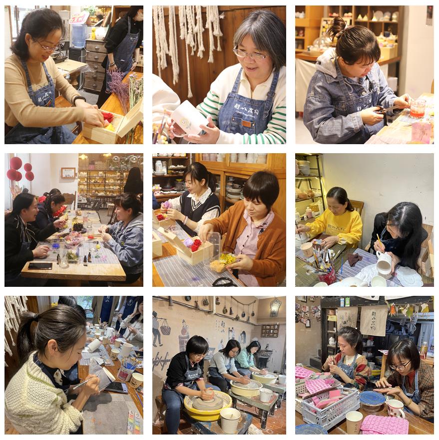 公司女員工們來到手工沙龍店,大家根據(jù)自己的喜好,分別開展手工活動?;顒宇愋椭饕兴姆N:釉下彩杯子繪畫、香薰蠟燭、永生花制作和陶藝?;顒蝇F(xiàn)場,女員工們興致勃勃、熱情高漲。認真聆聽老師的講解和明白了制作要領后,大家開始自己動手嘗試。