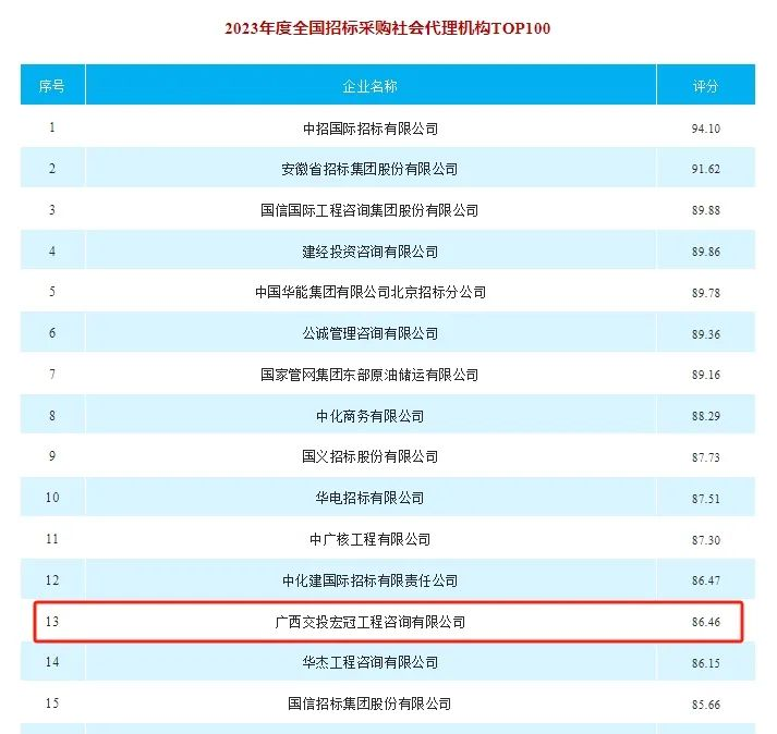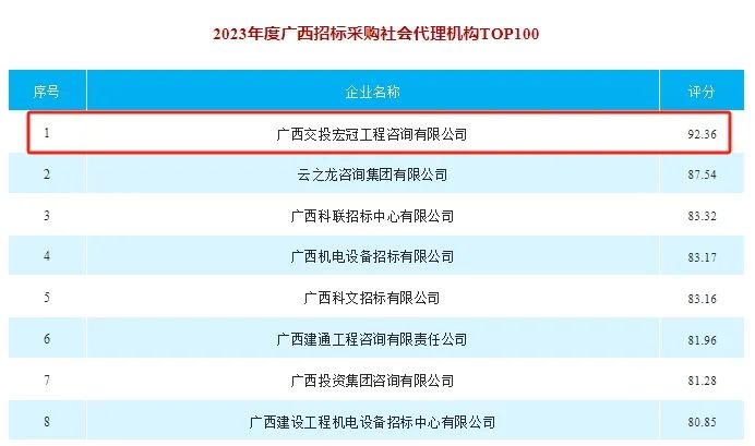 近日,在比地招標(biāo)招采大數(shù)據(jù)平臺(tái)發(fā)布的2023年度社會(huì)代理機(jī)構(gòu)招標(biāo)采購(gòu)榜單中,廣西交投宏冠工程咨詢有限公司以92.36和86.46的評(píng)分分別位居2023年度廣西招標(biāo)采購(gòu)社會(huì)代理機(jī)構(gòu)第一名和2023年度全國(guó)招標(biāo)采購(gòu)社會(huì)代理機(jī)構(gòu)第十三名!據(jù)了解,榜單數(shù)據(jù)來(lái)源于公開(kāi)發(fā)布的全網(wǎng)招標(biāo)采購(gòu)項(xiàng)目,評(píng)估樣本以項(xiàng)目所屬地劃分省份,根據(jù)中標(biāo)項(xiàng)目金額與中標(biāo)項(xiàng)目數(shù)量,分別以60%和40%的權(quán)重進(jìn)行綜合評(píng)估。評(píng)估時(shí)間為2023年1月1日~2023年12月31日。宏冠公司在廣西2340家和全國(guó)68429家代理機(jī)構(gòu)中脫穎而出,真正詮釋了用數(shù)據(jù)印證實(shí)力。